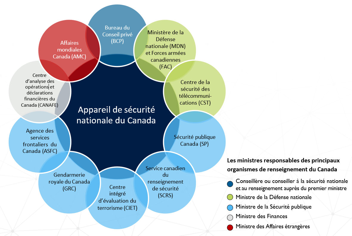 Diagramme représentant les ministres responsables des principaux organismes de renseignement du Canada au sein de l'appareil de sécurité nationale du Canada