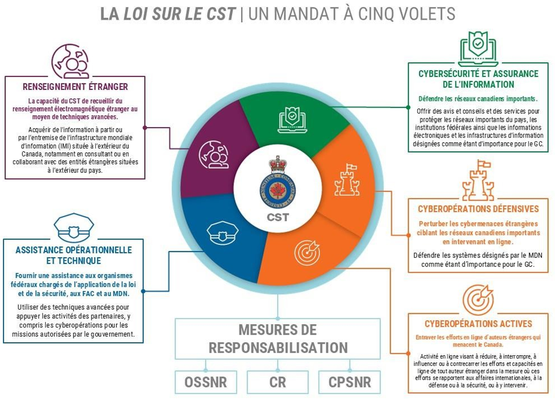 Le mandat du CST tel qu'il est présenté dans la loi sur le CST. Le mandat est divisé en cinq parties :
