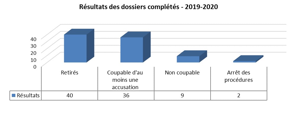 23. Le Service d’avocats de la défense a offert une représentation juridique dans 152 dossiers. Ce chiffre inclut 75 dossiers reportés de l’année précédente et 77 nouveaux dossiers. Parmi ces 152 dossiers, 87 ont été complétés. De ce nombre, les accusations ont été retirées dans 40 dossiers suivant la nomination et la participation d’un avocat de notre bureau. Parmi les 47 dossiers restant, neuf se sont soldés par un verdict de non culpabilité à toutes les accusations, deux par un arrêt des procédures, et 36 par un verdict ou un plaidoyer de culpabilité à au moins une accusation.