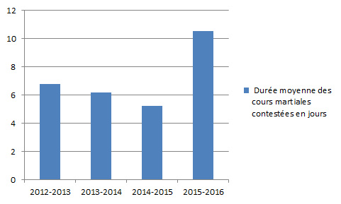 7 En considérant le nombre de mois où il y avait un poste de juge militaire vacant, il y avait en moyenne 3.75 juges militaires disponibles en 2014-2015 mais seulement 3 en 2015-2016.