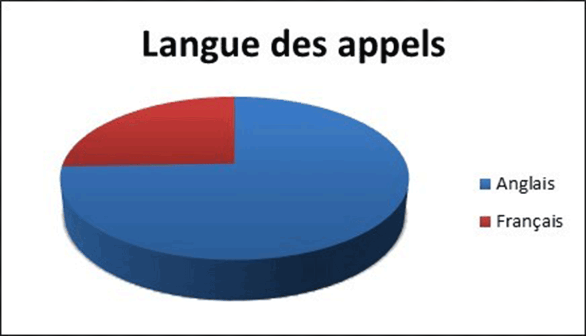 Langue des appels : graphique montrant 1,266 appels en anglais en bleue et 435 appels en français en rouge.