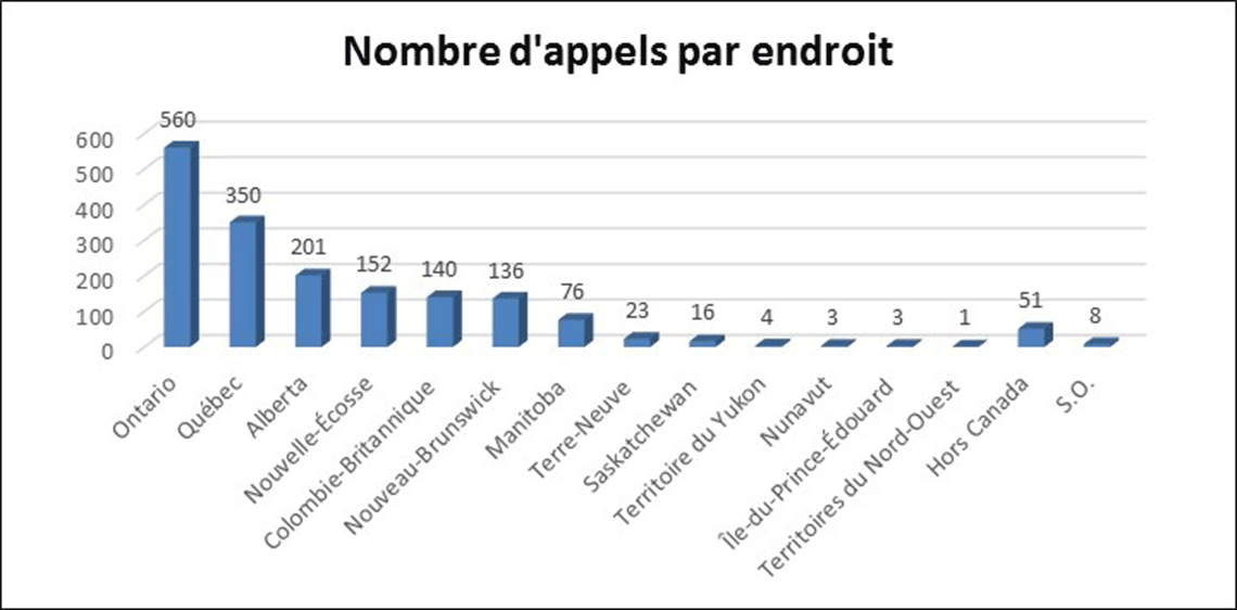 20. La durée des appels a varié, mais en moyenne, elle a été d’environ 15 minutes. Les appels provenaient de toutes les provinces et de tous les territoires du Canada, ainsi que de divers endroits situés à l’extérieur du Canada, de la part de militaires servant à l’étranger. Le graphique qui suit montre le nombre des appels reçus, par endroit.