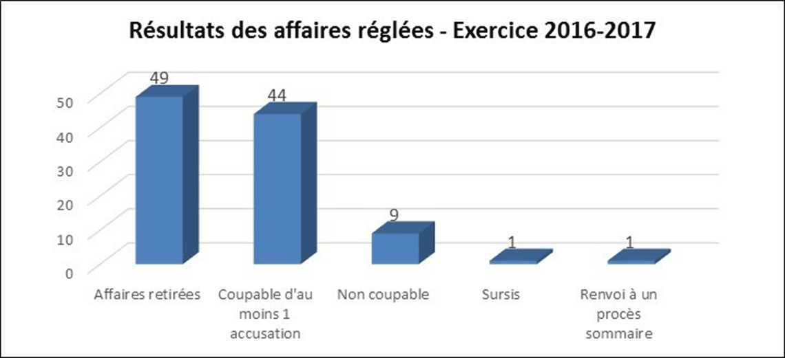 23. Sur les 200 dossiers actifs cette année, 104 ont été réglés au cours de la période visée par le présent rapport. Dans 49 de ceux-ci, les accusations ont été retirées sans procès mais après l’affectation d’un avocat et après un certain degré d’intervention de la part d’un avocat de la défense, allant de simples demandes de communication de la preuve, jusqu’à des discussions informelles avec la poursuite au sujet des questions liées à une perspective raisonnable de déclaration de culpabilité ou à l’intérêt du public à l’égard de la poursuite, en passant par le dépôt de requêtes plus officielles, ou encore du retrait des accusations devant un juge militaire le jour du procès. Un dossier a été renvoyé à l’unité en vue de la tenue d’un procès sommaire.