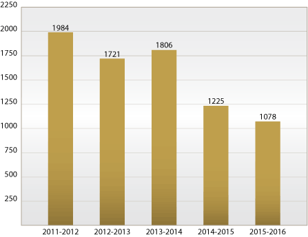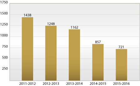 Au cours de la période de référence, un nombre total de 1 078 accusations ont donné lieu à 721 procès sommaires. Il s’agit d’une diminution de 147 accusations et de 136 procès sommaires comparativement à la période du dernier rapport. Cette tendance à la baisse du nombre d’accusations jugées par procès sommaire et du nombre total de ces procès est caractéristique des dernières périodes analysées. Par exemple, le nombre total d’accusations jugées par procès sommaire dans les rapports de 2013-2014 et 2014-2015 était de 1 806 et 1 225, respectivement, et le nombre total de procès sommaires pour les mêmes périodes était de 1 162 et 857, respectivement. La figure 3-2 indique le nombre de procès sommaires tenus par année depuis 2011-2012, et la figure 3-3 indique le nombre d’accusations ayant été jugées par procès sommaire par année depuis 2011-2012.