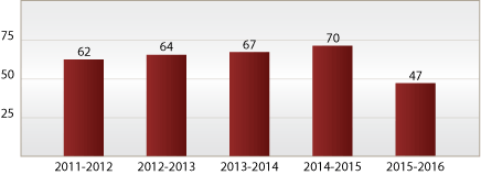 En tout, 47 procès se sont déroulés en cour martiale au cours de la période visée par le présent rapport – 40 en cour martiale permanente et sept en cour martiale générale – ce qui représente à peine plus de 6 p. 100 des tribunaux militaires. Ces chiffres représentent une diminution importante de 23 procès en cour martiale, ou environ 33 p. 100 de moins, comparativement au dernier rapport, affichant 61 cours martiales permanentes et neuf cours martiales générales. Cette diminution semble liée au fait que seulement trois juges militaires siégeaient au cours de la période de référence, alors que quatre siégeaient la plupart du temps lors de la période précédente12. La figure 3-8 présente le nombre annuel de procès jugés en cour martiale depuis 2011-2012.