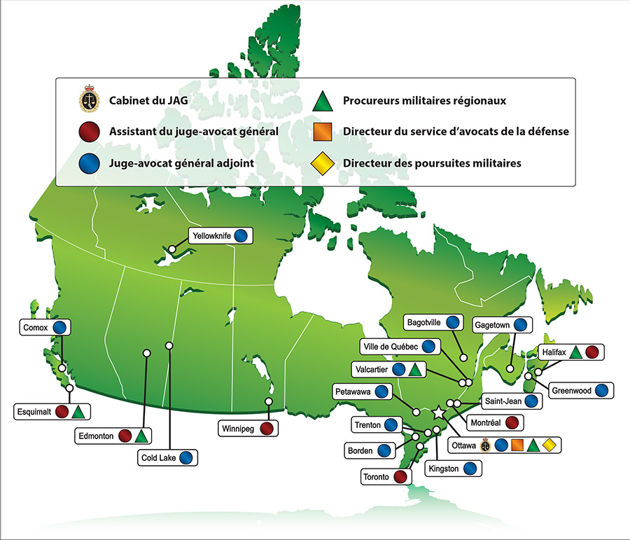Les bureaux régionaux des AJAG sont situés à Ottawa, Halifax, Montréal, Toronto, Winnipeg, Edmonton, Esquimalt, ainsi qu’en Allemagne et à Colorado Springs. Qui plus est, plusieurs bureaux de juges-avocats adjoints d’un bout à l’autre du Canada rendent des comptes directement à leur AJAG régional respectif.