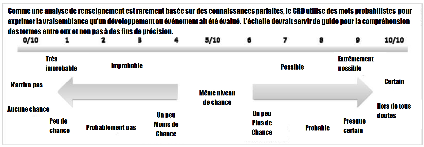 L'image est une échelle numérique de 1 à 10 qui sert de guide pour la compréhension de la relation entre les mots de probabilité utilisés pour exprimer la vraisemblance d’un développement ou événement évalué.