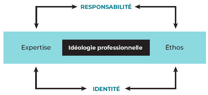 Le graphique représente les quatre attributs professionnels de manière carrée avec la responsabilité en haut, l'identité en bas, l'expertise à gauche et l'éthique à droite. Des flèches multidirectionnelles circulent autour du forme carré, indiquant un retour d'information entre l'expertise, et la responsabilité et l'identité, et entre l'éthos, et la responsabilité et l'identité. L’idéologie professionnelle forme une boîte turquoise autour de l’expertise et de l’éthos horizontalement à travers le diagramme.