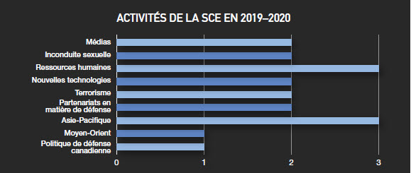 En 2019-2020, MINDS s'est associé à des parties prenantes de l'ensemble de l'Équipe de la Défense pour organiser 18 activités sur des questions qui reflètent les défis divers et complexes auxquels est confronté le MDN/FAC. Le tableau suivant présente leurs sujets, qui vont de l'impact des nouvelles technologies à l'inconduite sexuelle et aux comportements haineux. Une liste détaillée de toutes les activités figure à Annex B.