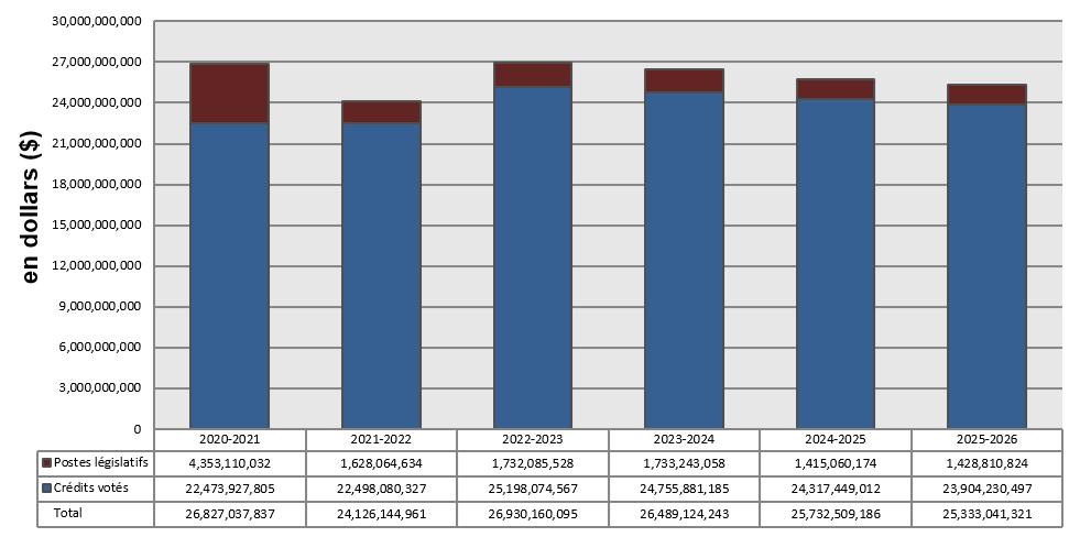 Sur l’axe Y se trouvent des dollars de 0 à 30 000 000 000. Sur l’axe X se trouve l’année financière 2020-2021 à 2025-2026.