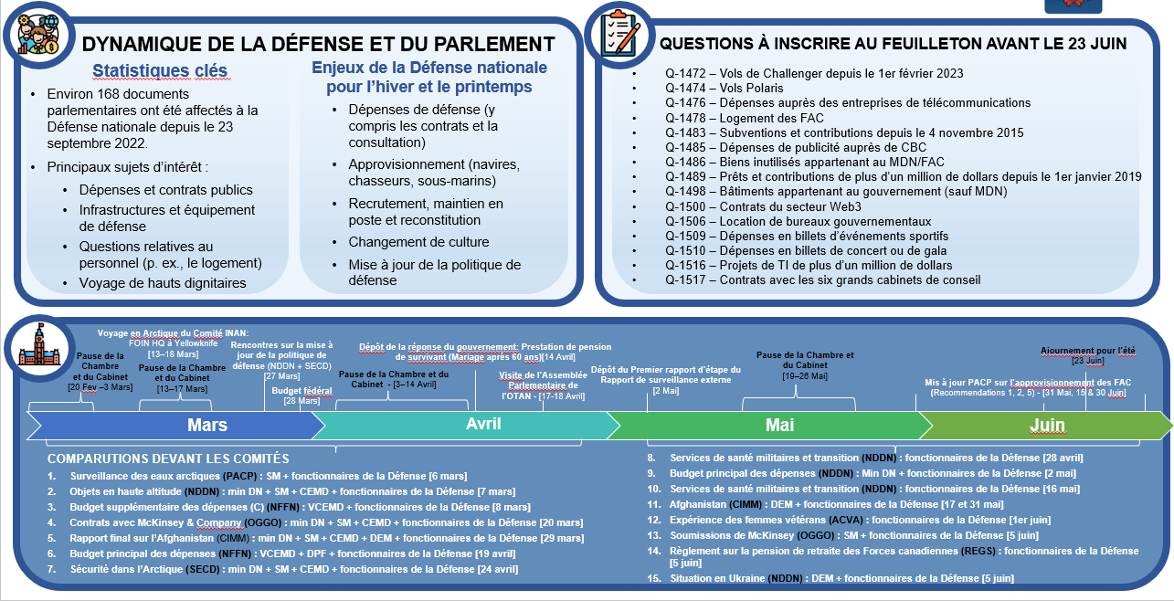 Cette diapositive présente les perspectives parlementaires pour l'hiver et le printemps 2023. L'image est divisée en trois sections : la dynamique de la défense et le Parlement, les OPQ à déposer avant le 23 juin et un calendrier de mars à juin.