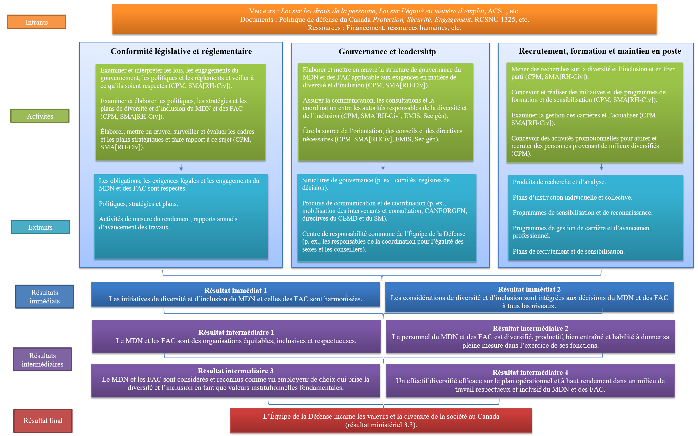 Les activités et les initiatives de diversité et d’inclusion du MDN et des FAC dans le domaine des RH désignent les deux segments de programme susmentionnés, « Diversité et inclusion pour le personnel civil » et « Développement stratégique du Commandement du personnel militaire », et sont liées aux deux résultats immédiats ci‑après du PGEDNote de bas de page 5 :