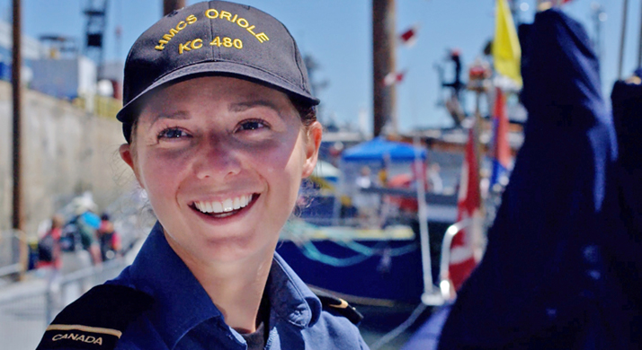 Je suis aspirant de marine Chrystelle Cloutier, membre de l’équipage du HMCS Oriole. En donnant des tours aux ports où est-ce qu’on arrêtait, là j’ai rencontré des gens qui montraient des photos d’eux sur ces bateaux-là voilà 30 ans, puis là ils avaient la chair de poule en parlant de leur histoire, puis ils nous racontaient tout ce qu’ils ont fait, les choses bien, les choses mal qui sont arrivées, puis là ça m’a vraiment fait sentir comme, dans quoi je suis présentement c’est vraiment plus gros que ce que je pensais. Ça fait que je suis vraiment fière d’être sur ce bateau-là.