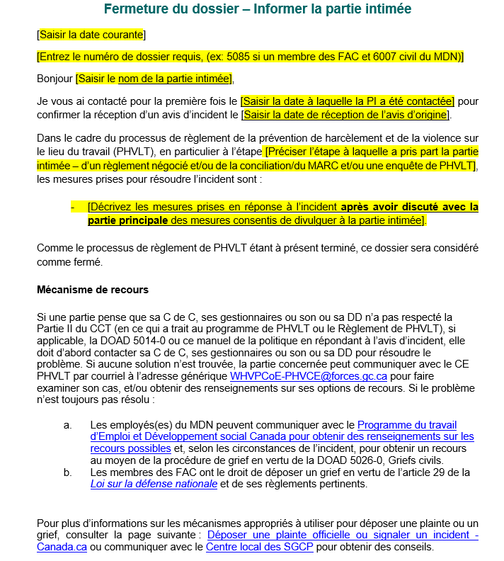 Gabarit de communication pour la prévention du harcèlement et de la violence dans le lieu de travail : Lettre de fermeture du dossier - Partie intimée
