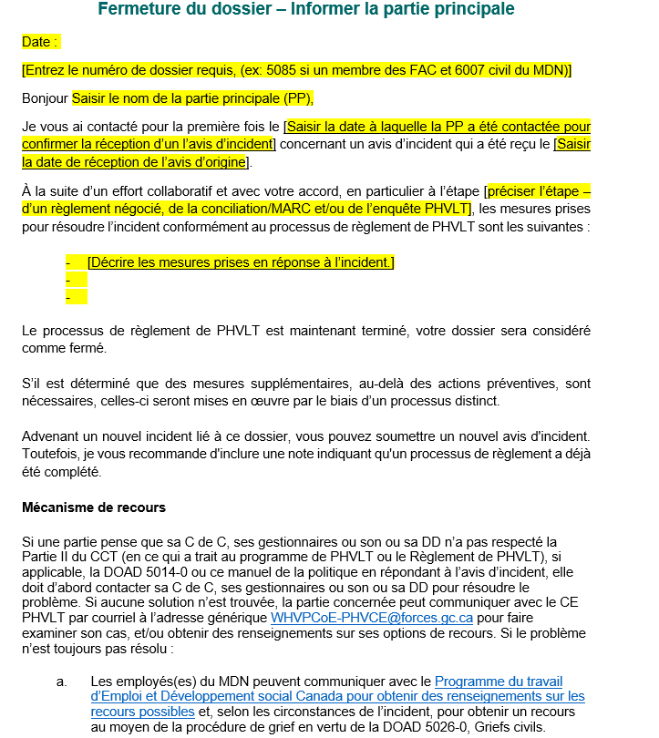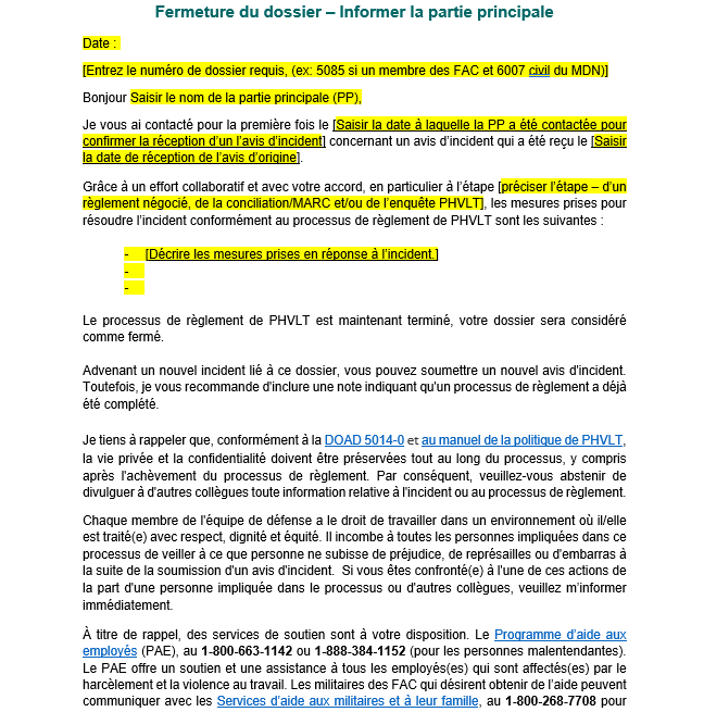 Gabarit de communication pour la prévention du harcèlement et de la violence dans le lieu de travail : Lettre de fermeture du dossier - Partie principale