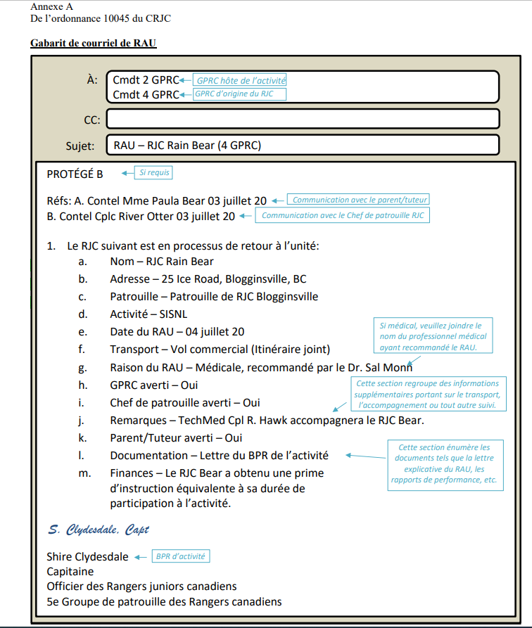 - Remarques – TechMed Cpl R. Hawk accompagnera le RJC Bear. (Cette section regroupe des informations supplémentaires portant sur le transport, l’accompagnement ou tout autre suivi.)