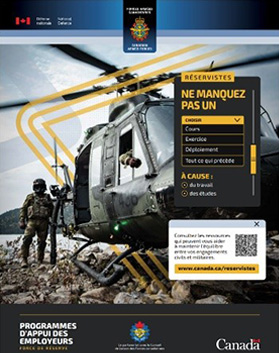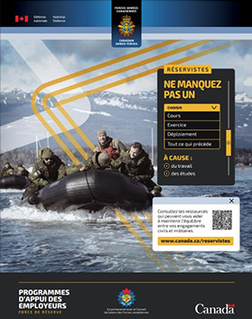 Téléchargez des affiches à diffuser en ligne ou à imprimer pour faire la promotion des outils pouvant aider les réservistes à concilier obligations militaires et civiles.