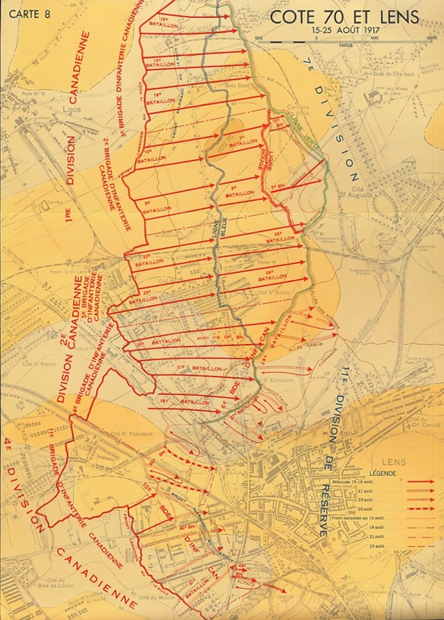En juillet 1917, le Corps canadien reçoit l’ordre de prendre la ville de Lens. Le nouveau commandant du Corps, le lieutenant général sir A.W. Currie, prévoit de s’emparer d’abord de la cote 70, qui domine Lens au nord.