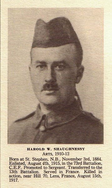 Harold Wilfred Shaughnessy naît le 3 novembre 1884, à St. Stephen, au Nouveau-Brunswick, de Mary Margaret Shaughnessy et de John Shaughnessy. Il exerce le métier de sténographe avant de s’enrôler dans le Corps expéditionnaire canadien (CEC), à Montréal, le 4 août 1915.
