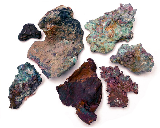 Plusieurs spécimens de cuivre naturel de la collection de Ressources naturelles Canada, placés selon leur lieu de provenance, des Territoires du Nord-Ouest jusqu’à Terre-Neuve-et-Labrador. Ces spécimens et d’autres métaux canadiens ont été ajoutés à l’alliage afin d’établir des liens avec toutes les régions du Canada.