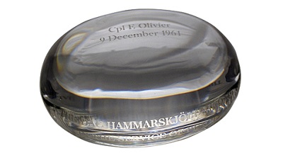 Ellipsoïde en cristal de verre au plomb incolore et transparent, d’environ 73 mm de largeur, 57 mm de profondeur et 38 mm d’épaisseur, sur lequel le nom et la date du décès du récipiendaire sont gravés sur la partie supérieure, ainsi que le logo des NU sur la partie inférieure avec les inscriptions THE DAG HAMMARSKJÖLD - IN THE SERVICE OF PEACE et MÉDAILLE DAG HAMMARSKJÖLD – AU SERVICE DE LA PAIX sur les deux côtés.