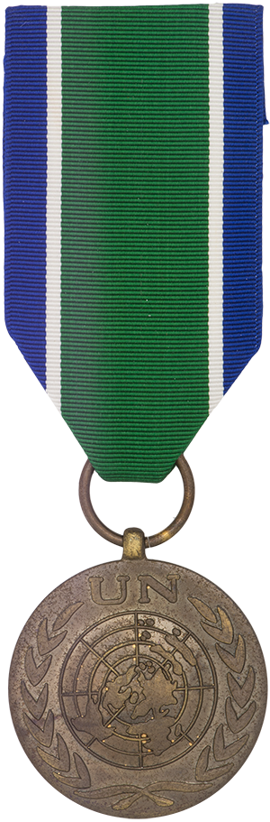 - sur le côté gauche de la poitrine, suspendue au ruban décrit ci-dessus, après la Médaille du Groupe d’observateurs militaires pour l’Inde et le Pakistan et avant la Médaille de l’Autorité exécutive temporaire des Nations Unies en Nouvelle‑Guinée occidentale.