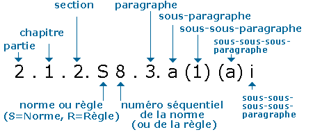 Dans le cas du paragraphe ci-dessus, offert à titre d’exemple : le ‘2’ représente la partie du MNT; le ‘1’ représente le chapitre; le ‘2’ représente la section; la lettre majuscule ‘S’ représente la norme (par contre, la lettre ‘R’ serait utilisée pour désigner une règle); le ‘8’ représente le numéro séquentiel de la norme (ou de la règle); le ‘3’ identifie le numéro du paragraphe; la lettre ‘a’ représente le sous-paragraphe; le ‘(1)’ représente le sous-sous-paragraphe; la lettre ‘(a)’ représente le sous-sous-sous-paragraphe; et le ‘i’ identifie le sous-sous-sous-sous paragraphe. Autrement dit, il s’agit du sous-sous-sous-sous paragraphe ‘i’ du sous-sous-sous paragraphe ‘(a)’ du sous-sous-paragraphe (1) du sous-paragraphe ‘a’ du paragraphe ‘3’ de la norme numéro 8 de la partie 2, chapitre 1 et section 2 du MNT.