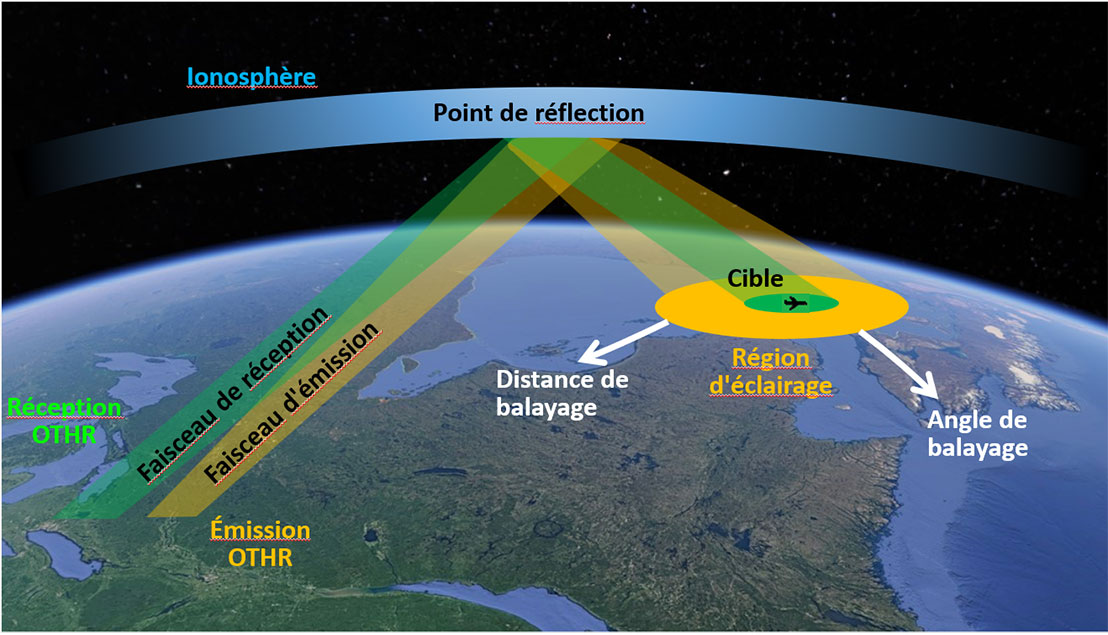 Le radar transhorizon permet d'exercer une surveillance à des distances beaucoup plus grandes que la technologie radar ordinaire, en faisant rebondir les faisceaux radar sur l'ionosphère pour détecter ce qui se trouve autour de la courbure de la Terre (voir la figure 1).