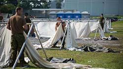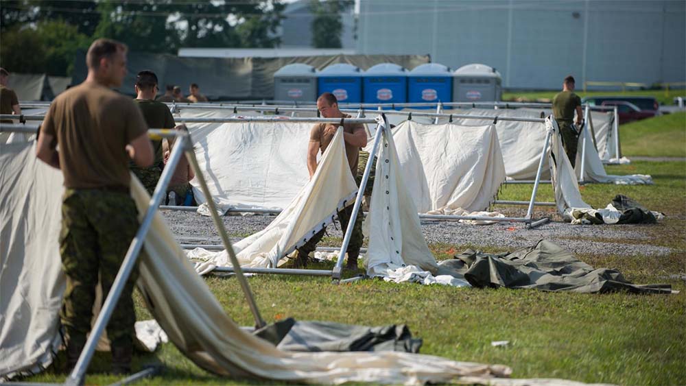 Les FAC ont été chargées de fournir des quartiers temporaires et de les rendre accessibles à leurs partenaires fédéraux et civils. Les FAC ont mis sur pied deux centres provisoires d’hébergement, un à Saint-Bernard-de-Lacolle, au Québec, et l’autre dans les installations de NAVCAN à Cornwall, en Ontario. Ces centres étaient composés de tentes modulaires chauffées et éclairées.