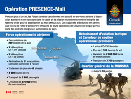 L'opération PRESENCE (Mali) était la contribution des FAC à la Mission intégrée multidimensionnelle de stabilisation des Nations Unies au Mali (MINUSMA), en soutien à la stratégie des opérations de paix du gouvernement du Canada.