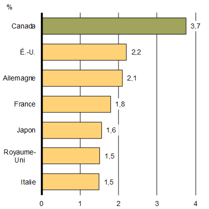Le plan du gouvernement consistant à investir dans la classe moyenne et dans l’économie fonctionne. Le Canada connaît actuellement la plus forte croissance économique parmi les pays du Groupe des Sept (G7) (graphique 1). La confiance des consommateurs et la consommation par les ménages constituent les principaux facteurs de cette forte croissance, grâce en partie aux retombées de l’Allocation canadienne pour enfants (ACE). L’économie canadienne a créé plus de 450 000 emplois depuis la fin de l’année 2015, et le taux de chômage est descendu à son plus bas niveau depuis 2008. Le chômage des jeunes a atteint un niveau historiquement bas, et la croissance du produit intérieur brut (PIB) devrait s’élever à 3,1 % en 2017, ce qui dépasse considérablement les attentes établies en début d’année.