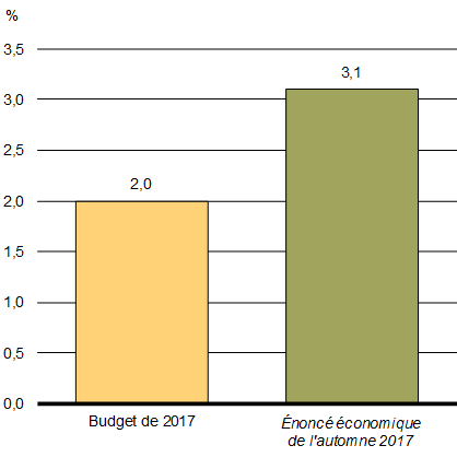 Les projections budgétaires exposées dans l’Énoncé économique de l’automne de 2017 sont fondées sur la moyenne des perspectives de l’enquête économique de septembre 2017 auprès d’économistes du secteur privé. Les changements apportés aux hypothèses concernant la croissance économique peuvent aussi avoir d’importantes répercussions sur le solde budgétaire et sur le ratio de la dette au PIB sur une période de projection prolongée.