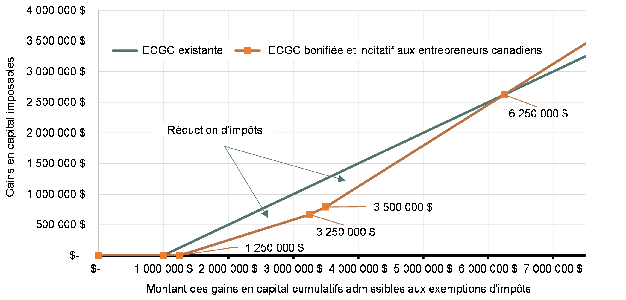 En définitive, quand l'incitatif aux entrepreneurs canadiens sera pleinement mis en œuvre, combiné avec l'exonération cumulative totale des gains en capital de 1,25 million de dollars, les entrepreneuses et les entrepreneurs bénéficieront d'au moins 3,25 millions en exonération cumulative totale et partielle des gains en capital.