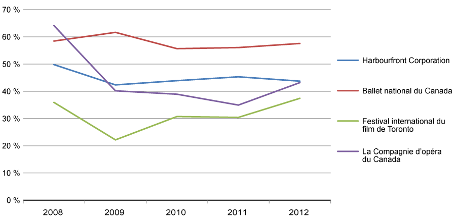 Les constatations de l’évaluation, d’après les entrevues réalisées auprès des intervenants clés, ont permis de confirmer que le soutien continu qu’offre le gouvernement fédéral par l’intermédiaire du PFHC offre aux autres bailleurs de fonds et commanditaires une impression positive de la stabilité du HC. Ces intervenants estiment que l’engagement dont le gouvernement fédéral a fait preuve vient renforcer la capacité du HC à solliciter des fonds auprès d’autres ordres de gouvernement et commanditaires. En particulier, les intervenants ont indiqué qu’il est difficile pour des organismes comme le HC d’obtenir des commandites externes pour couvrir leurs dépenses de fonctionnement, ce qu’offre le PFHC, comparativement au financement des immobilisations propre à des projets et à des programmes. Ce point de vue est soutenu par le rapport du Groupe d’experts indépendant sur les programmes de subventions et de contributions du gouvernement fédéral, qui a été commandé en 2006 par le président du Conseil du Trésor du Canada et qui visait à « recommander les mesures à prendre pour rendre l’exécution des programmes de subventions et de contributions plus efficace, tout en assurant une plus grande responsabilisation5 ». Le rapport indique que « [l]es revenus du secteur communautaire sans but lucratif proviennent principalement de contributions et de subventions » et que « [c]ertaines organisations du secteur communautaire sans but lucratif génèrent des revenus au moyen des services qu’elles fournissent, mais la plupart d’entre elles sont centrées sur la programmation. Elles sont donc fortement tributaires des transferts du gouvernement et considérablement touchées par les changements d’orientation de la politique gouvernementale6. » Ce niveau de dépendance à l’égard du financement gouvernemental semble s’appliquer à des organismes qui ont des secteurs d’activité semblables à ceux du HC, mais dont les structures de propriétaire et de financement sont différentes. Par exemple, le Centre des arts de la Confédération situé à Charlottetown (également un organisme à but non lucratif) et les sociétés d’État, dont le Centre national des Arts et le Vieux-Port de Montréal, tirent une proportion importante (plus de 50 p. 100) de leurs revenus (en pourcentage des revenus totaux) de subventions et de contributions ou de crédits7.