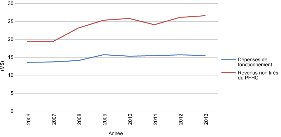 Le PFHC offre au HC un financement d’exploitation et une base stable pour ses opérations. Depuis 2006, le PFHC a fourni au HC un financement qui se situe entre 32 p. 100 et 40 p. 100 des dépenses de fonctionnement du HC.