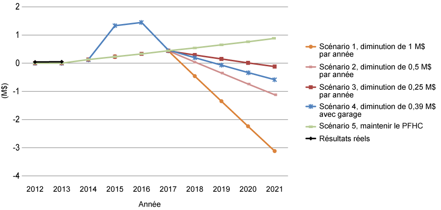 | Année | Financement du PFHC | Total des revenus non tirés du PFHC | Garage YQ4 | Total des revenus non tirés du PFHC avec le garage | Total des revenus | Dépenses totales | Revenus moins dépenses (avec garage) | Gains/pertes cumulatifs |