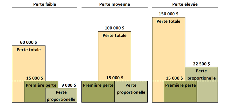 La figure 4 illustre la façon dont les pertes des prêteurs varieraient selon les approches de la première perte et de la perte proportionnelle, selon les niveaux illustratifs de partage des risques avec les prêteurs et divers degré de gravité des réclamations. L’exemple présente trois scénarios, selon des prêts en défaut de paiement présentant des degrés variés de pertes sur prêt totales, avec toutefois le même montant d’encours du principal sur le prêt au moment du défaut de paiement (c’est-à-dire, A = 300 000 $).