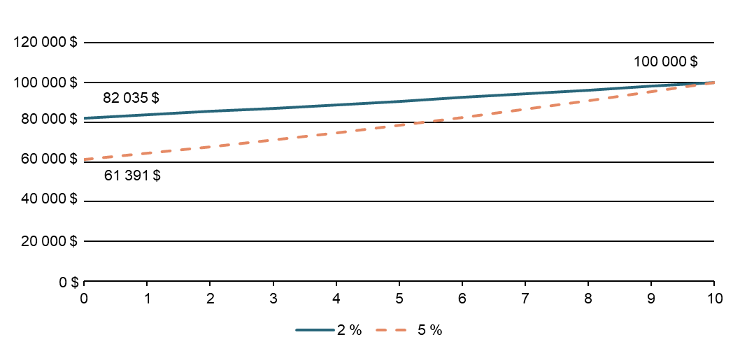 Le tableau suivant illustre la différence dans la comptabilisation d’un paiement de 100 000 $ dû dans 10 ans, dans des scénarios de taux d’actualisation de 2 % et de 5 %. Avec un taux de 2 %, l’obligation initiale est supérieure (à 82 035 $), mais les charges restantes reconnues au cours de son cycle de vie sont inférieures (17 965 $, ce qui représente la différence entre l’obligation initiale et le montant de 100 000 $ à payer). Avec un taux d’actualisation de 5 %, l’obligation initiale est inférieure (à 61 391 $), mais les charges restantes reconnues au cours de son cycle de vie sont supérieures (à 38 609 $). La charge totale inscrite de 100 000 $ dans les deux scénarios est la même. Le choix du taux d’actualisation a seulement une incidence sur le moment de comptabilisation.