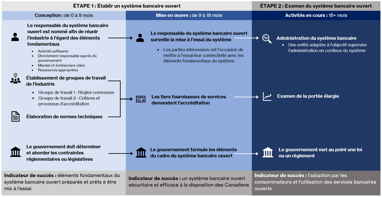 Dans l'immédiat, le Comité recommande que le Gouvernement désigne un responsable du système bancaire ouvert qui sera chargé de rassembler l'industrie, le gouvernement et les consommateurs en vue de concevoir les fondements du système bancaire ouvert, lesquels devraient être finalisés dans les neuf mois suivant la nomination du responsable. Après une période d'essais et d'accréditation subséquente, le système devrait être opérationnel dans les 18 mois.