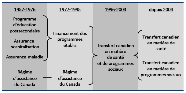 Les paiements de transfert à l’appui de la santé et des programmes sociaux ont évolué au fil du temps; prenant au départ la forme de programmes à frais partagés, ils se sont transformés en transferts globaux. L’illustration ci-dessous montre l’évolution de ces transferts.