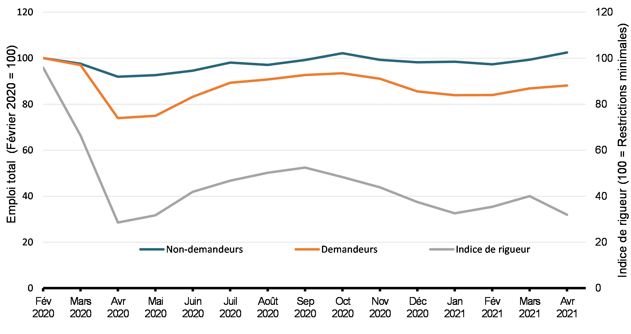 Dans tous les ralentissements, une autre raison pour laquelle il faut prévenir ou retarder les licenciements est que la recherche, l’embauche et la formation de nouveaux employés sont coûteuses pour les employeurs. De plus, les employés acquièrent des compétences propres à un emploi dans un rôle donné, et (traduction) « les séparations risquent de détruire cette précieuse source d’emploi particulière », tandis que le chômage est associé à des résultats défavorables sur les plans de l’économie et de la santé pour les travailleurs et leurs collectivités (Giupponi et coll., 2021). Cela est particulièrement vrai pour le chômage de longue durée (Nichols et coll., 2013). Le fait de continuer de verser des salaires aux employés et d’encourager la réembauche a également aidé les employeurs à reprendre leurs activités normales, à mesure que les restrictions liées à la pandémie étaient levées et que la demande était rétablie.