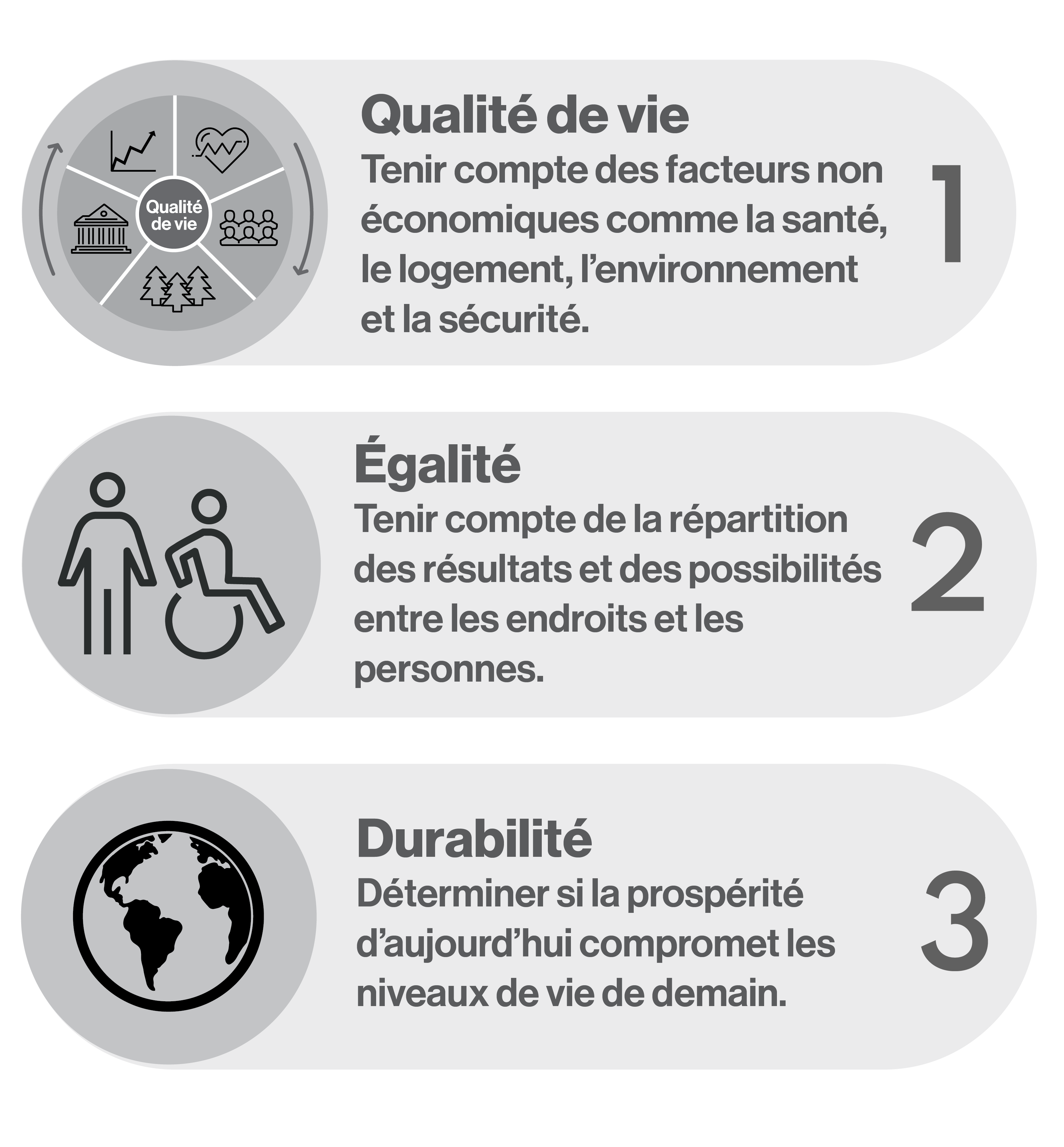 De ces termes, « qualité de vie » est le plus large : la prospérité, un niveau de vie élevé, une croissance inclusive et un développement durable sont tous des facteurs importants qui contribuent à une bonne qualité de vie pour tous.