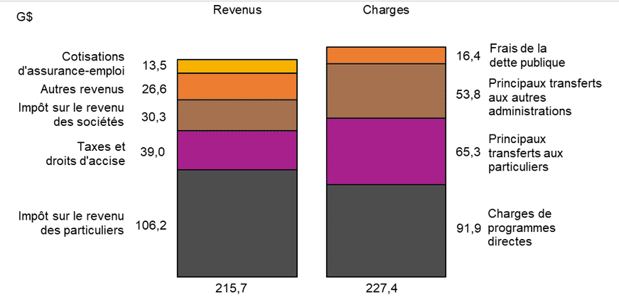 Le mois de novembre 2019 s'est soldé par un déficit budgétaire de 2,7 milliards de dollars, comparativement à un déficit de 2,2 milliards en novembre 2018. Les revenus ont augmenté de 0,8 milliard (3,1 %), principalement en raison de la hausse des rentrées d'impôt sur le revenu. Les charges de programmes ont augmenté de 1,3 milliard (5,2 %), sous l'effet de l'augmentation des principaux transferts aux particuliers et des principaux transferts aux autres administrations. Les frais de la dette publique ont diminué de 0,1 milliard (3,4 %), ce qui reflète en partie les rajustements mensuels moins importants apportés à la valeur des obligations à rendement réel en fonction de l'indice des prix à la consommation (IPC).