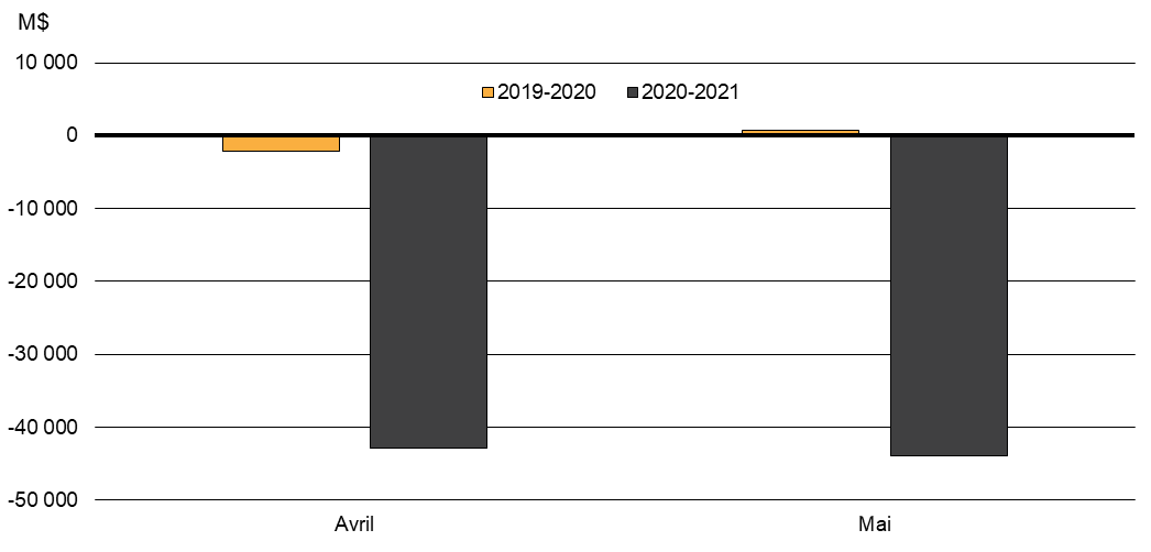 Les deux premiers mois de l’exercice 2020-2021 (avril et mai) se sont soldés par un déficit budgétaire de 86,8 milliards de dollars, comparativement à un déficit de 1,4 milliard pour la même période en 2019-2020. Ventilé par mois, ce déficit s’élevait à 42,8 milliards en avril et à 43,9 milliards en mai. La variation sans précédent des résultats financiers du gouvernement reflète la grave détérioration de la situation économique et les mesures temporaires mises en œuvre par l’intermédiaire du plan d’intervention économique du gouvernement destiné à soutenir les Canadiens et les entreprises du pays qui font face à des difficultés financières en raison de l’éclosion de la COVID-19. Il est dans l’ensemble conforme au solde budgétaire présenté dans le Portrait économique et budgétaire (juillet).