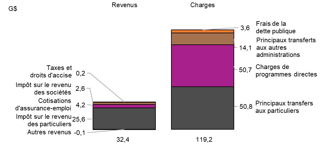 Au total pour ces deux mois, les revenus ont baissé de 24,1 milliards de dollars (42,6 %), ce qui est principalement attribuable à la baisse des rentrées d’impôt sur le revenu et des autres revenus. Les charges de programmes ont augmenté de 62,4 milliards (117,4 %), en raison surtout des transferts versés aux entreprises et aux particuliers en vertu du Plan d’intervention économique, y compris par l’intermédiaire de la Prestation canadienne d’urgence (PCU), de la Subvention salariale d’urgence du Canada (SSUC), de l’incitatif de 25 % du Compte d’urgence pour les entreprises canadiennes (CUEC) et de la Prestation canadienne d’urgence pour les étudiants (PCUE). Les frais de la dette publique ont diminué de 1,2 milliard (24,5 %), ce qui s’explique en grande partie par des rajustements moins importants apportés à la valeur des obligations à rendement réel en fonction de l’indice des prix à la consommation.