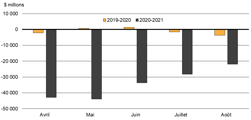 Pour la période d’avril à août de l’exercice 2020-2021, le gouvernement a affiché un déficit budgétaire de 170,5 milliards de dollars, comparativement à un déficit de 5,2 milliards pour la même période de 2019-2020. La variation sans précédent des résultats financiers du gouvernement reflète la grave détérioration de la situation économique et les mesures temporaires mises en œuvre dans le cadre du plan d’intervention économique du gouvernement destiné à soutenir les Canadiens et les entreprises du pays qui font face à des difficultés financières en raison de l’éclosion de la COVID-19. Le solde budgétaire est dans l’ensemble conforme à celui des projections du Portrait économique et budgétaire présenté en juillet.