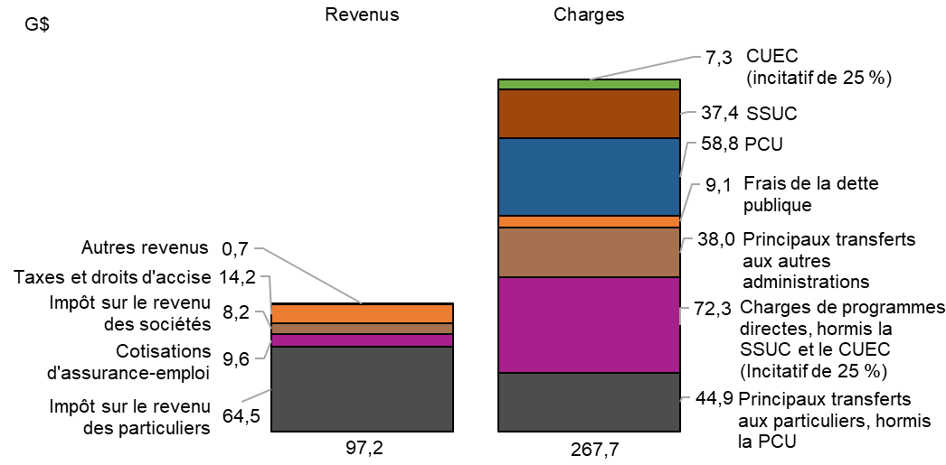 Les revenus ont baissé de 39,6 milliards de dollars (29,0 %), ce qui est principalement attribuable à la baisse généralisée des revenus, notamment celle des rentrées d’impôt sur le revenu et des autres revenus. Les charges de programmes ont augmenté de 127,4 milliards (97,1 %), en raison surtout des transferts versés aux particuliers et aux entreprises en vertu du Plan d’intervention économique, y compris par l’intermédiaire de la Prestation canadienne d’urgence (PCU), de la Subvention salariale d’urgence du Canada (SSUC) et de l’incitatif de 25 % du Compte d’urgence pour les entreprises canadiennes (CUEC). Les frais de la dette publique ont diminué de 1,8 milliard (16,2 %), ce qui s’explique en grande partie par des rajustements moins élevés de la valeur des obligations à rendement réel en fonction de l’inflation de l’indice des prix à la consommation et par la baisse des intérêts sur les bons du Trésor du gouvernement du Canada.