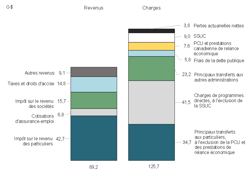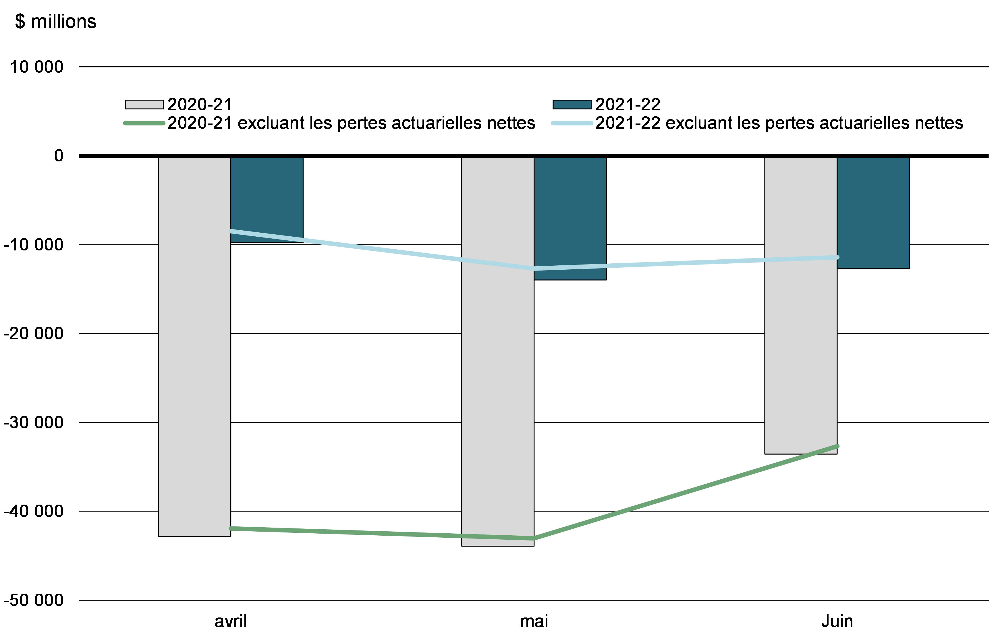 Le mois de juin 2021 s'est soldé par un déficit budgétaire de 12,7 milliards de dollars, comparativement à un déficit de 33,6 milliards en juin 2020. Le déficit budgétaire avant les pertes actuarielles nettes se chiffrait à 11,4 milliards de dollars, comparativement à un déficit de 32,7 milliards pour la même période de 2020-2021. Le solde budgétaire excluant les pertes actuarielles nettes a pour but de compléter le solde budgétaire traditionnel afin de rendre les rapports financiers du gouvernement plus transparents, en isolant l'incidence de l'amortissement des pertes actuarielles nettes découlant de la réévaluation des régimes de retraite et autres avantages futurs des employés du gouvernement.