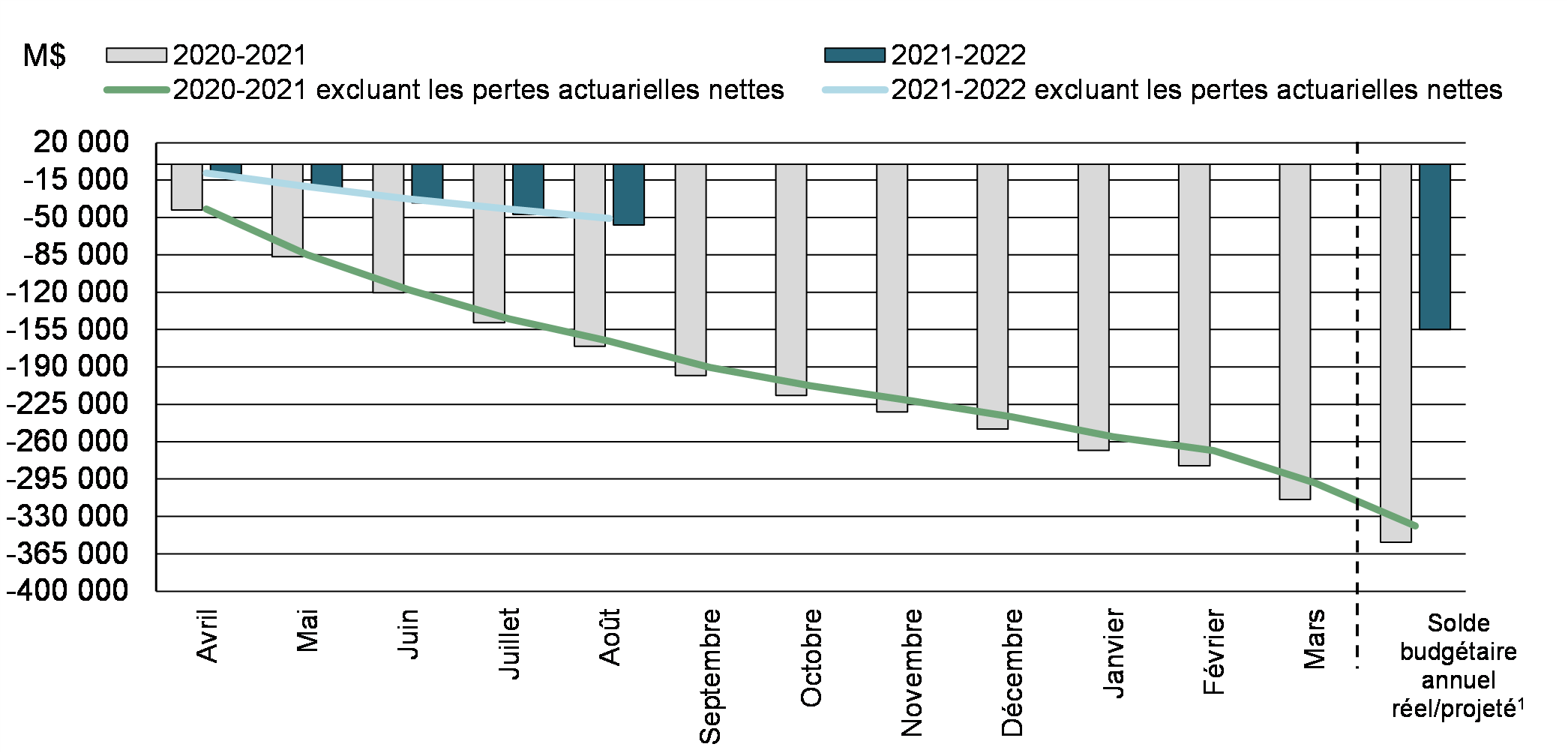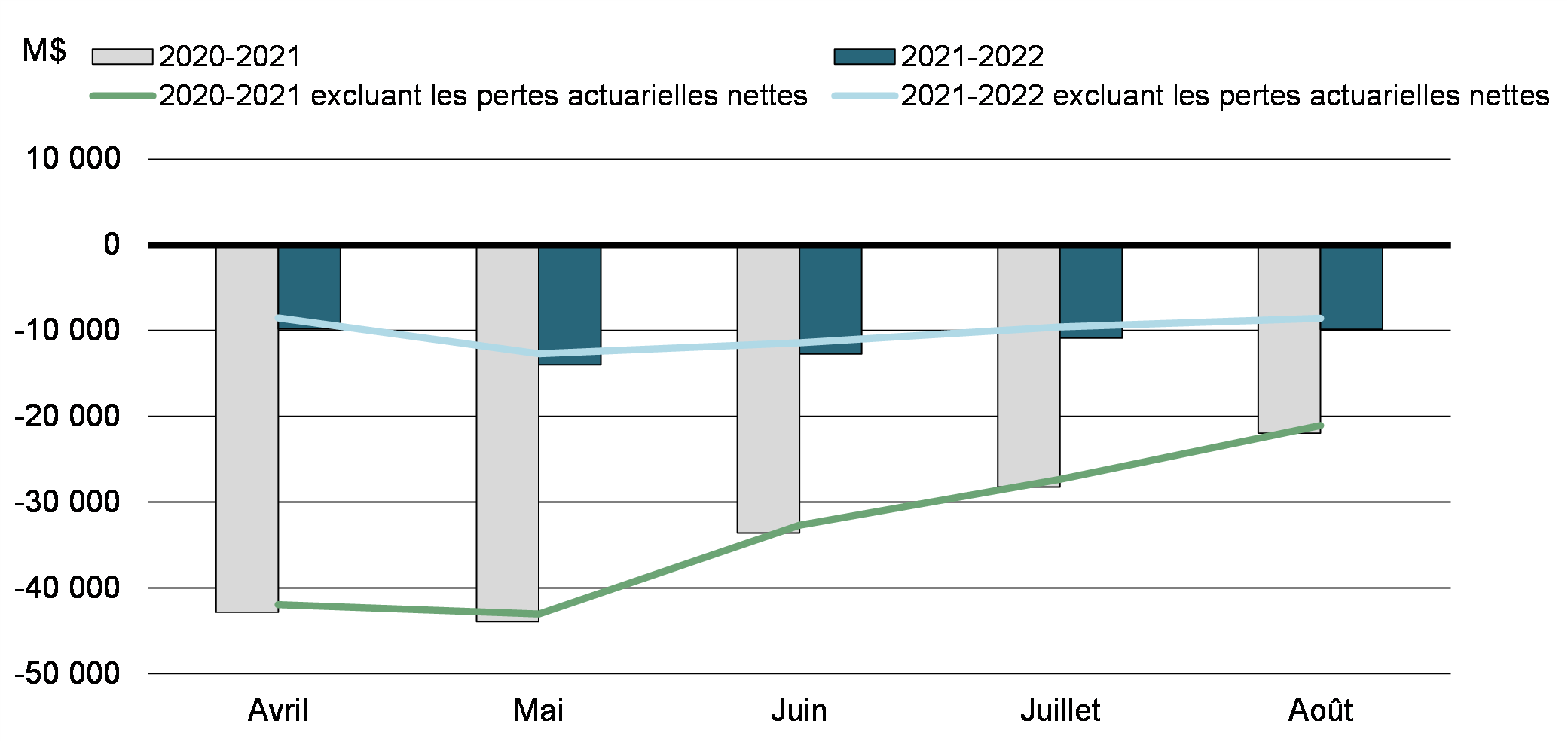 Le mois d'août 2021 s'est soldé par un déficit budgétaire de 9,8 milliards de dollars, comparativement à un déficit de 21,9 milliards en août 2020. Le déficit budgétaire avant les pertes actuarielles nettes se chiffrait à 8,5 milliards de dollars, comparativement à un déficit de 21,0 milliards pour la même période de 2020-2021. Le solde budgétaire excluant les pertes actuarielles nettes a pour but de compléter le solde budgétaire traditionnel afin de rendre les rapports financiers du gouvernement plus transparents, en isolant l'incidence de l'amortissement des pertes actuarielles nettes découlant de la réévaluation des régimes de retraite et autres avantages futurs des employés du gouvernement.