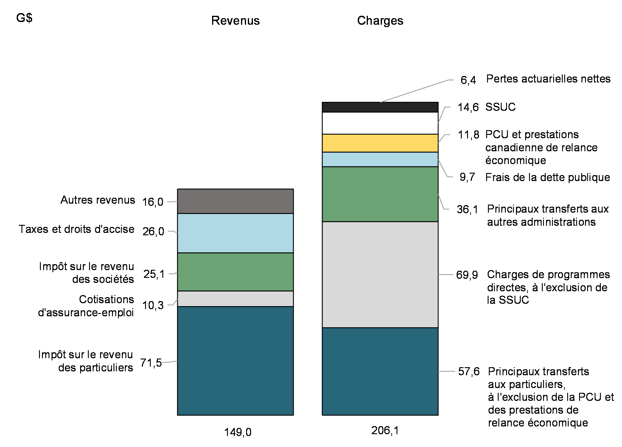 - Les charges de programmes excluant les pertes actuarielles nettes ont diminué de 64,1 milliards de dollars (25,2 %), en raison principalement de la baisse des paiements de transfert versés aux particuliers et aux entreprises en vertu du Plan d'intervention économique, notamment la Prestation canadienne d'urgence (PCU) et les prestations canadiennes de relance économique, la Subvention salariale d'urgence du Canada (SSUC) et la partie non remboursable des prêts du Compte d'urgence pour les entreprises canadiennes (CUEC).